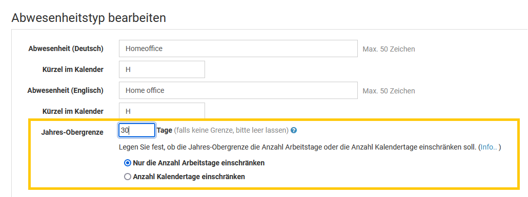 Screenshot: Jahresobergrenze für Abwesenheiten
