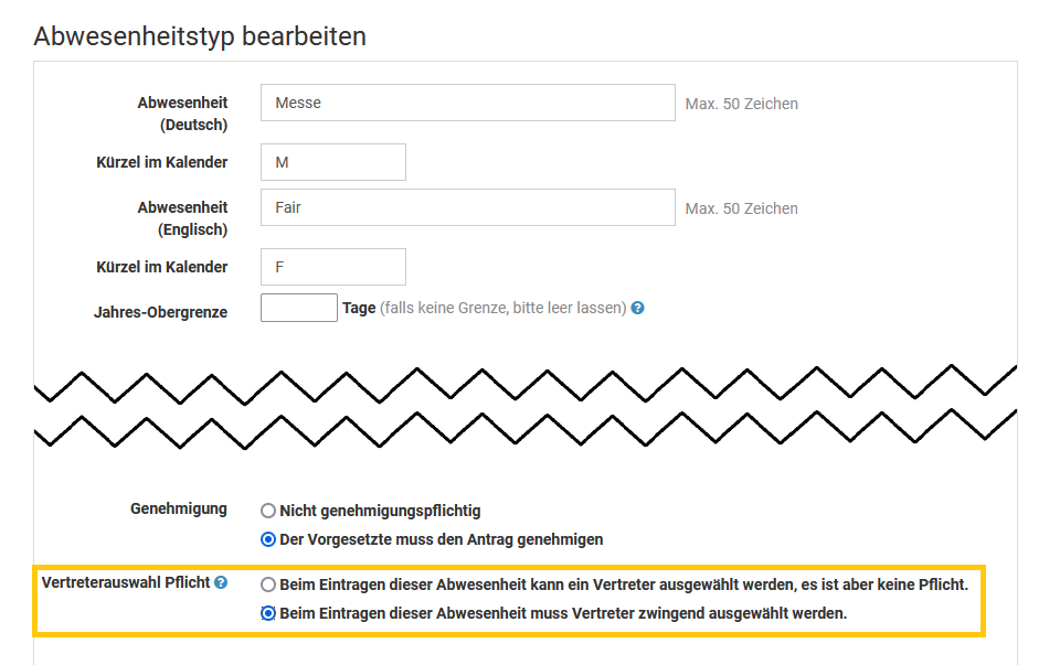 Vertreterauswahl Pflicht" sehen Sie, bei welchen Abwesenheitstypen ein Vertreter ausgewählt werden muss.