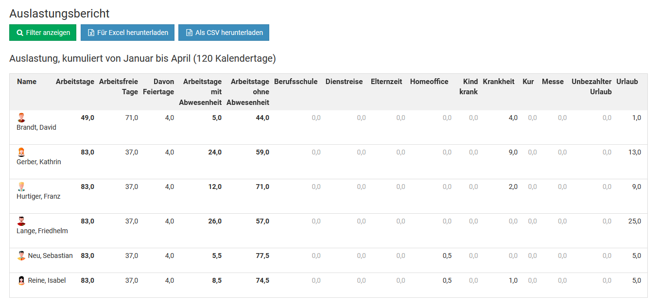 Im kumulierten Bericht erhalten Sie die Information über die Summe der Arbeitstage/Urlaubstage für alle Abwesenheiten in dem gewählten Zeitraum. Diese Zahlen sind monatsscharf berechnet. Wenn also ein Urlaubsantrag im Mai startet und in den Juni ragt, Sie den kumulierten Bericht für Mai aufrufen, dann werden nur die Urlaubstage des Urlaubsantrages in dem Bericht eingerechnet, die in den Mai fallen. Für die