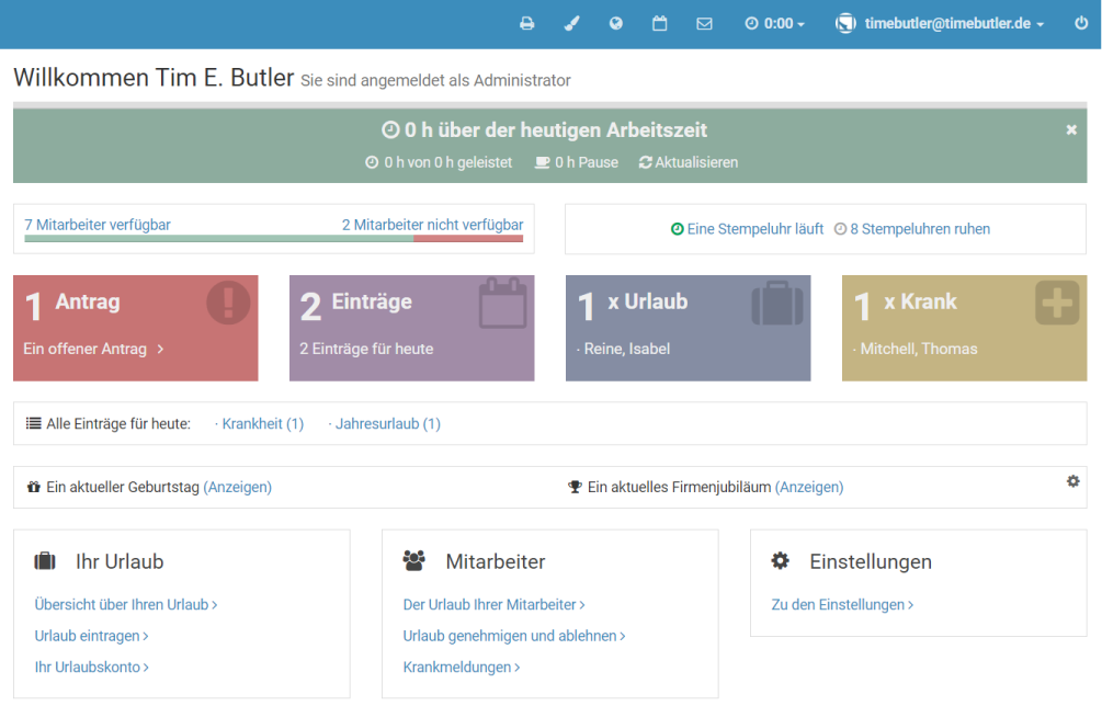 Direkt nach der Anmeldung an Ihrem Timebutler Nutzerkonto gelangen Sie zu dem Dashboard - Ihrem Cockpit mit der übersichtlichen Darstellung aller relevanten Informationen auf einer Seite.