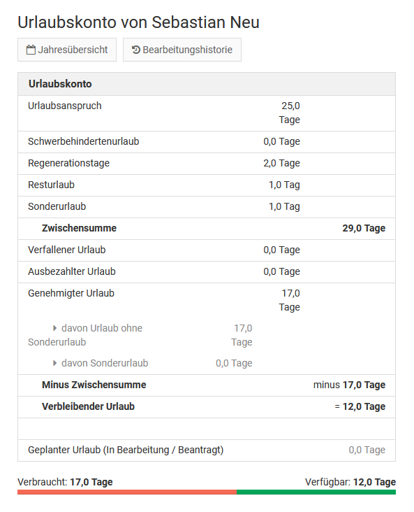 Screenshot: Beispiel-Urlaubskonto eines Mitarbeiters