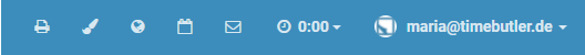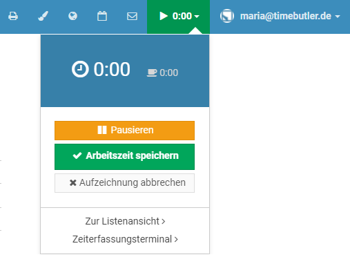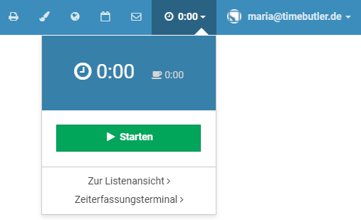 Nach der Anmeldung am Timebutler wird auf allen Seiten rechts oben ein " 00:00" für die Stempeluhr angezeigt: