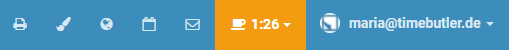 Um die Stempeluhr zu pausieren, klicken Sie auf die Zeitangabe in der Leiste und klicken dann in der Stempeluhr auf den Button "Pausieren". In der Leiste wird die Anzeige der Stempeluhr orange angezeigt und damit signalisiert, dass die Stempeluhr pausiert ist.
