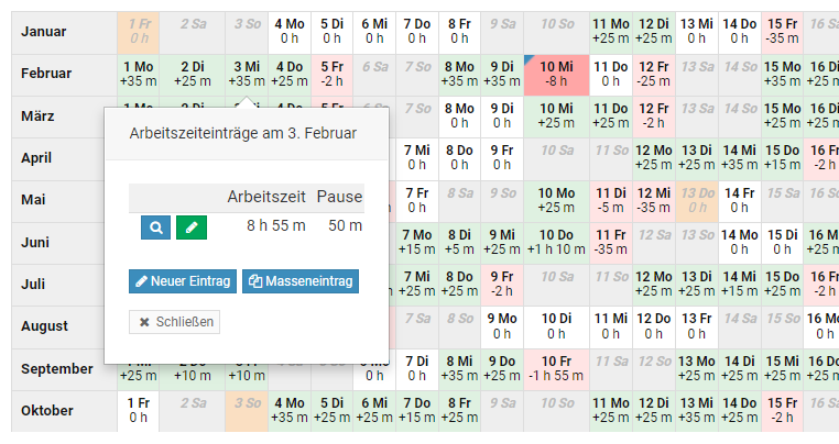 Mitarbeiter-Nutzer und Vorgesetzte erhalten direkt nach der Eintragung der Serieneinträge die Option, die Serieneinträge wieder rückgängig zu machen, also zu löschen. Wenn die Option nicht gewählt wird, dann können die Serieneinträge als ganzes nicht mehr gelöscht werden, sondern es kann nur jeder Eintrag aus der Serie einzeln gelöscht werden.