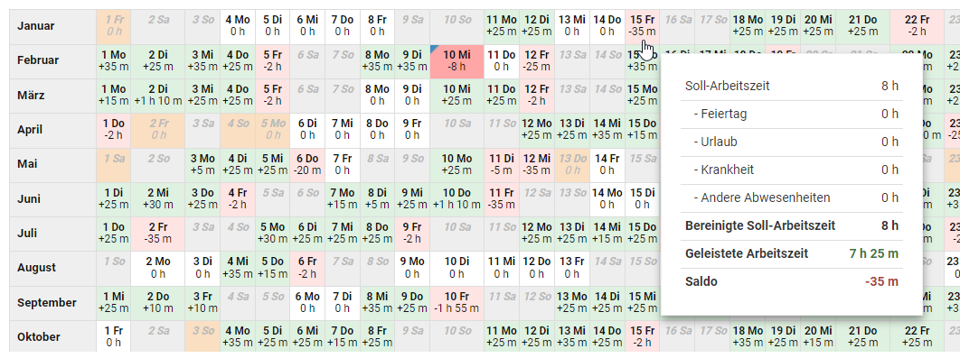 Urlaub und Krankheit werden automatisch im Arbeitszeitkonto abgezogen. Bei allen anderen Abwesenheitstypen haben Sie zwei Möglichkeiten: