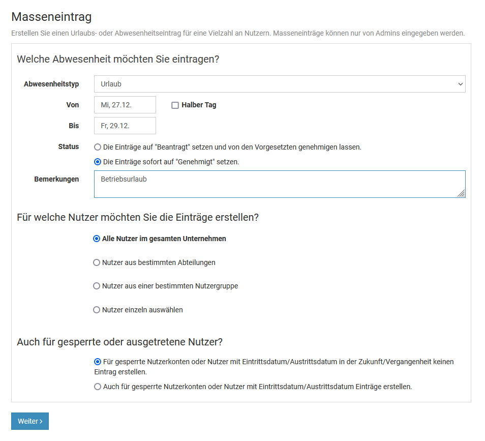 Für Admins steht die Möglichkeit bereit, einen Abwesenheitseintrag für alle oder eine Vielzahl an Mitarbeitern als