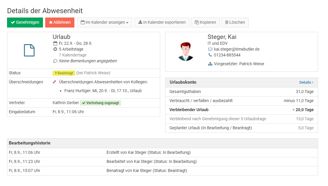 Um einen genehmigten Urlaubsantrag zu ändern ist es also erforderlich, den Abwesenheitseintrag zu löschen und einen neuen Abwesenheitseintrag einzugeben.