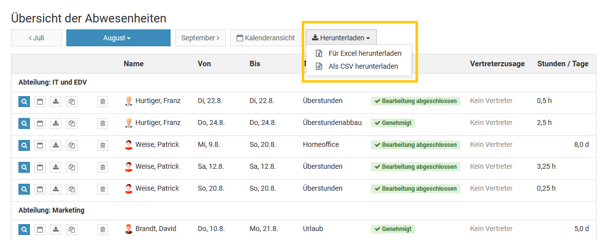 Abwesenheitseinträge im Status "